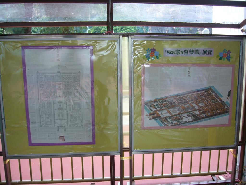 (在有蓋操場的兩大幅紫禁城地圖,感謝本館助理巧手製作邊套,令地圖無需被釘穿即可攤平展示。無損傷下保存可供學科老師日後使用。)